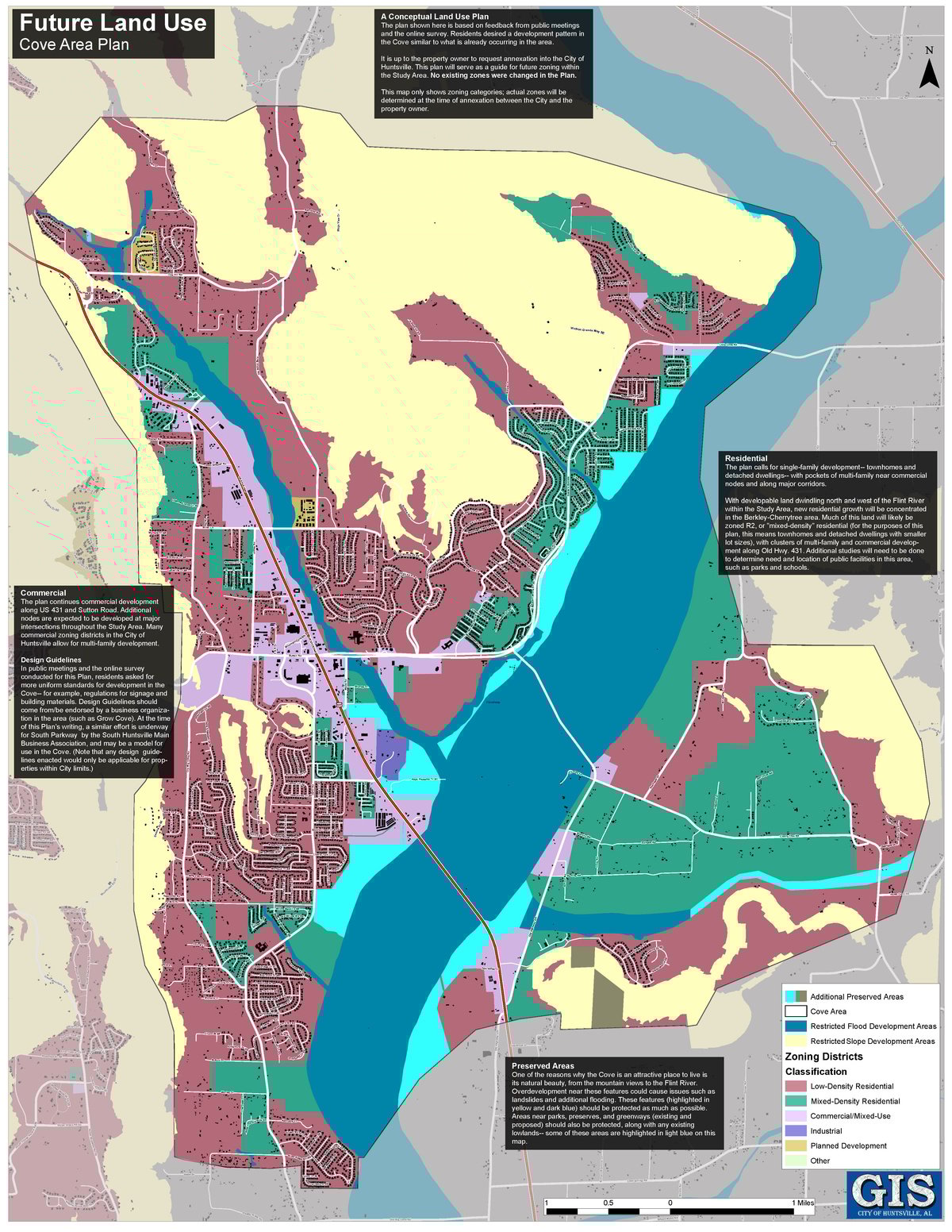 Land includes three contiguous parcels (61 acres, 3 acres, and 1 acre) that are annexable to the City of Huntsville. The City’s future land use map calls for “mixed density residential” in this geography supporting “missing middle” housing such as townhouses, cottages, and low-rise multifamily structures.